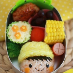 6月の初めに作った小太郎の2歳児教室用のお弁当です。小太郎のクラスはたんぽぽ組。黄色いたんぽぽの帽子の小太郎を作ってとリクエストされて作りました。同時作成はかたつむりのお弁当→ ☆☆☆小太郎、この日で3回目のお弁当でした。それまでの2回は食べやすいよう小