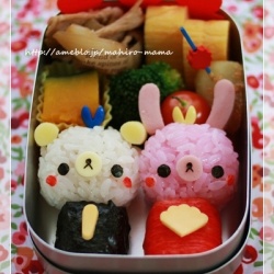 キャラ弁*クマちゃんとウサギちゃんのお雛様♪ 2012-3-3 記事を読む おはようございます。お弁当の更新、お休みしちゃおうかと思いましたがは季節物なので今日のうちに。昨日作った小太郎の2歳児教室用のお弁当です。 結局、太郎の夕ご飯になったんですけどね。幼稚園でクマちゃんとウサギちゃんのお雛様を作って小太郎がずっと気に入って離さ