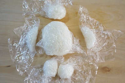 1.ご飯をラップに包み顔(10g強)と体(60g弱)、手(2つで15g)、足(2つで15g)を握ります。
