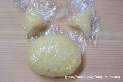 1.ご飯にデコふりを混ぜ、ラップに包んで顔、耳を握ります。