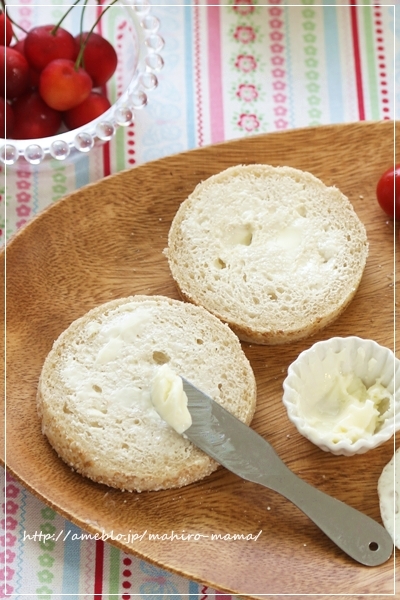 イングリッシュマフィンは半分に切ってトーストして発酵バターを塗って頂きました。