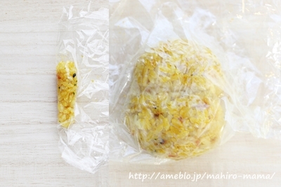 1.ご飯にカレーふりかけを混ぜ、体と手の部分を握ります。