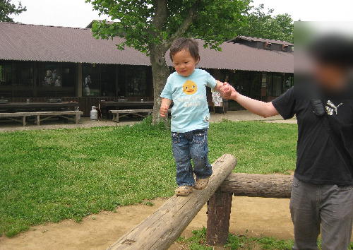 パパと手をつないでどんどん丸太の上を歩いたり、タイヤの上をジャンプしたり。