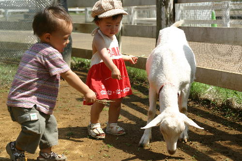 2人仲良くヤギにエサを。でも全く相手にされず・・・。