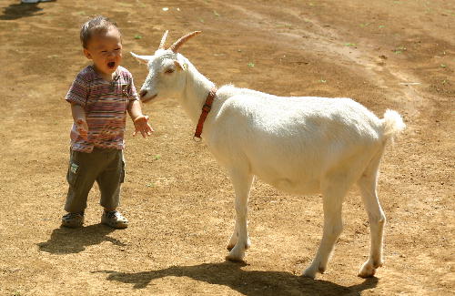 大好きなヤギに大興奮で「メーメー」言いっぱなし。