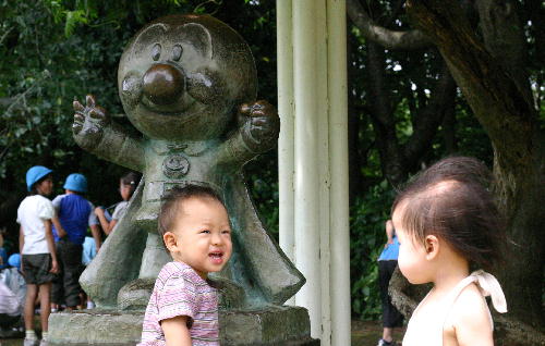 大好きなアンパンマンの銅像があって、テンションの上がる二人。