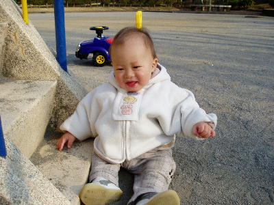 滑り台を登ろうとして、落ちてもこの笑顔。