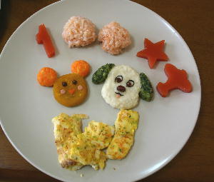 うーたん(かぼちゃ、にんじん)、真鯛のピカタ、ケチャップライスおにぎり、トマト寒天です。