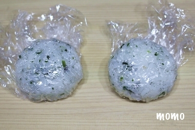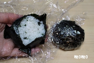 1.ご飯をラップに包み、やや横長の楕円を握る。(海苔で包んじゃうので何を混ぜてもOK!)