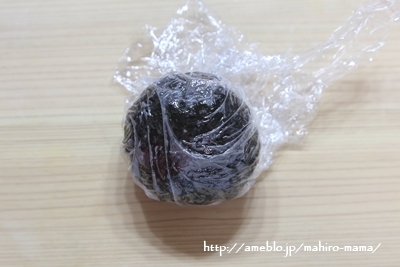 ひとつのおにぎりに海苔を巻き付ける。周囲に放射線状に切り込みを入れると巻きやすい。