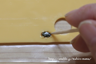 乾燥パスタを1.5cmに折り耳のパーツに刺す。