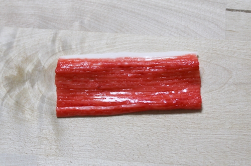 2.カニカマの表面の赤い部分をそっと剥がします。