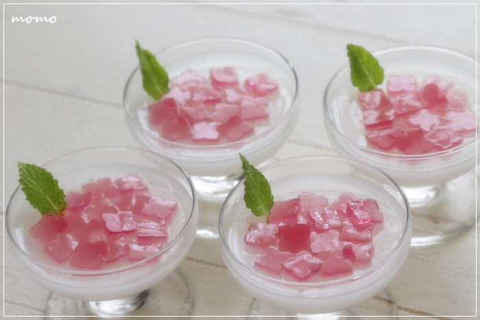 上のお花は型が抜けるよう寒天で作ったしっかりゼリーです。