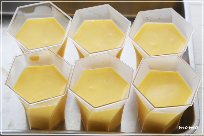 冷めたらマンゴーピューレ、生クリームを加えて混ぜカップに入れて冷やし固める。