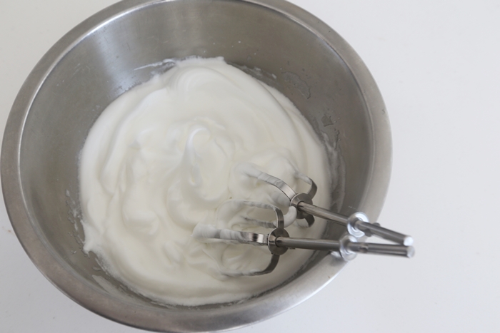 2.卵を卵黄、卵白に分け、卵白に半量の砂糖を少しづつ加えしっかりと角が立つまで泡立てる。
