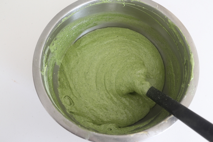 7.ふるった小麦粉、抹茶を加え下からすくい上げるように混ぜる 。