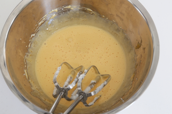 3.卵黄に残りの砂糖を入れもったりするまで泡立てる。