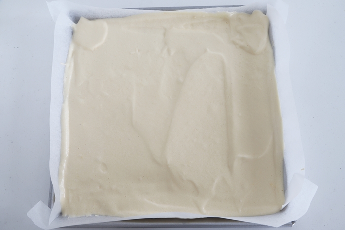 4.クッキングシートを敷いたロールケーキ型に3の生地を流し込み、表面を平らにします。