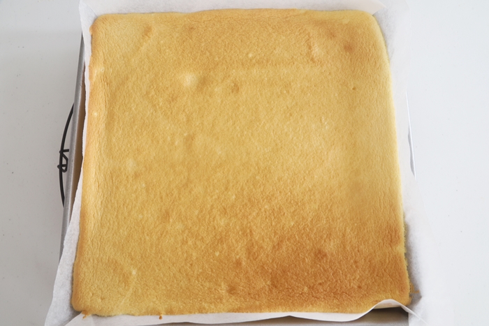 冷めたらスポンジのきれいな面を下にして、クッキングシートの上に置き、