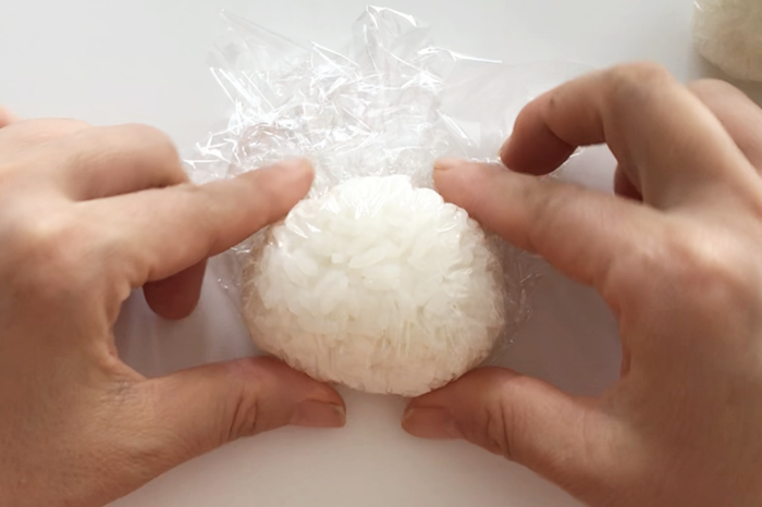 1.ごはんを2等分しラップに包み顔を握る。