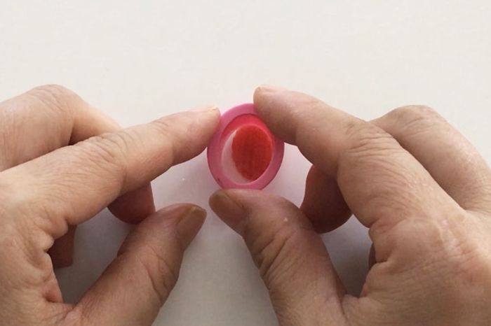 11.かに風味かまぼこの表面の部分を剥がしだ円型で2度抜きして口を作る。