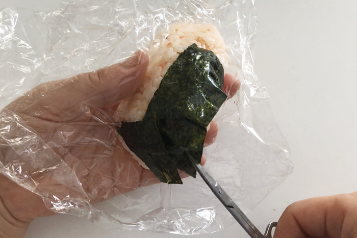 2.耳用(約10g)にごはんを残しラップに包み顔を握る。