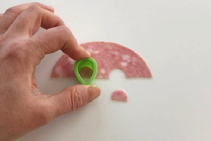 5.ビアソーセージをしずく型で抜き耳の模様を作る。