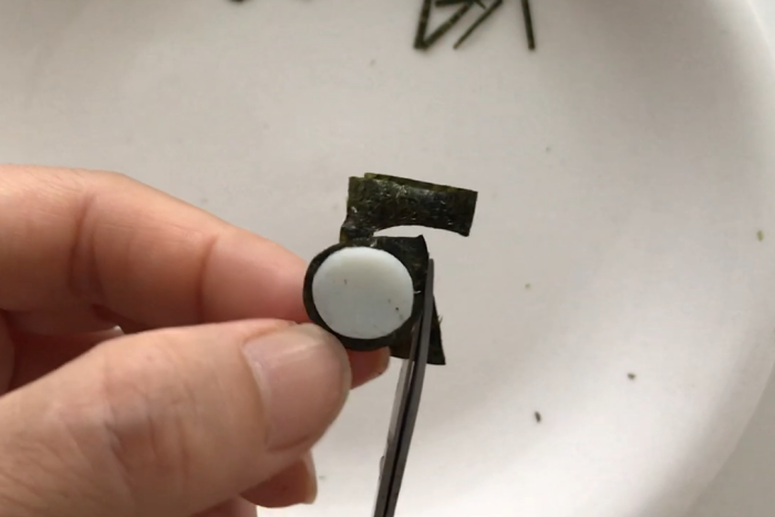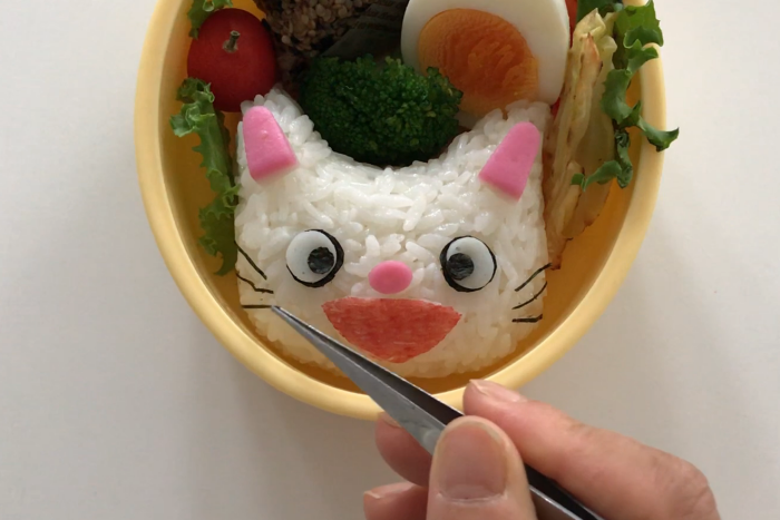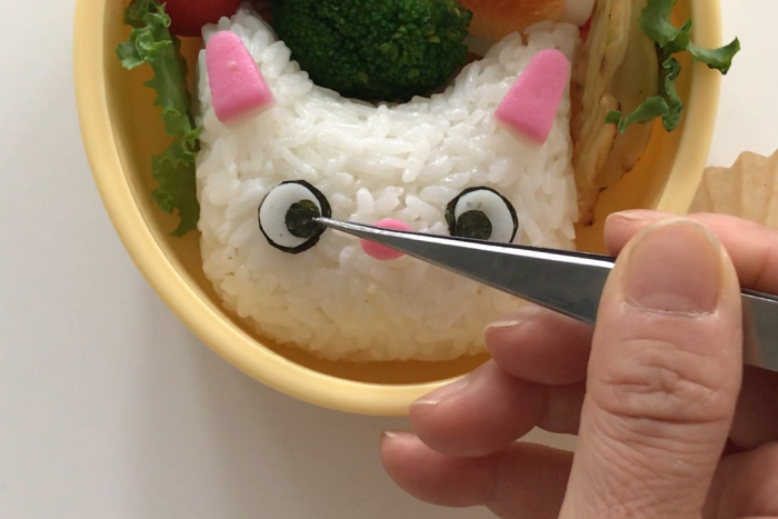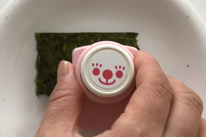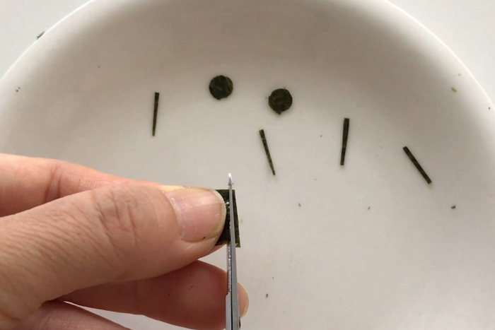 ひげは刻みのりを使えばもっと簡単に。かに風味かまぼこはナイフ出来るとバラバラになりやすい為、型で抜いています。