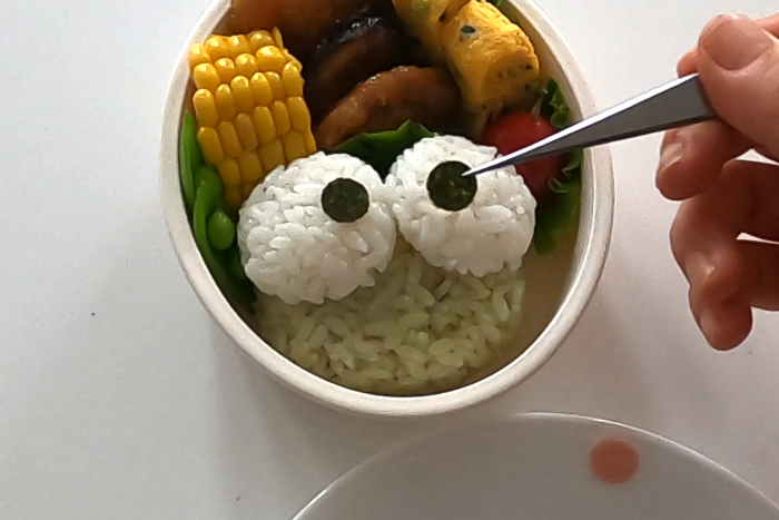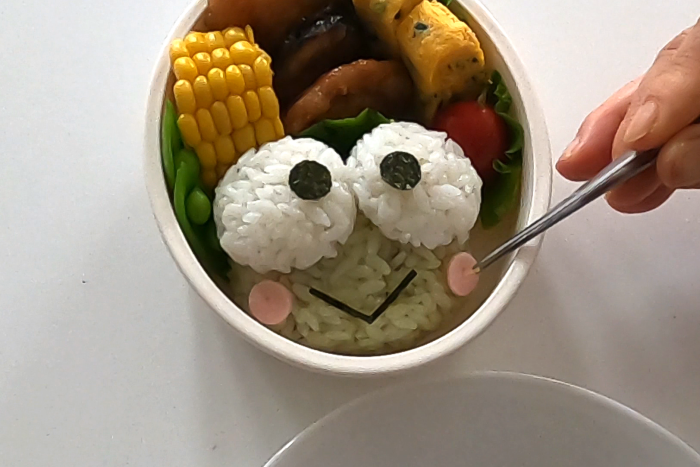 顔の緑色は手軽に“デコふり”を使用しましたが、青菜や枝豆などをすり潰して混ぜても
