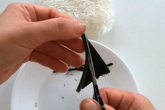 海苔は海苔パンチで抜く場合はパリパリの状態でOKですが、はさみで切る場合は割れて切り難いので早めに出しておいたり蒸気にあてしんなりさせると切りやすいです。