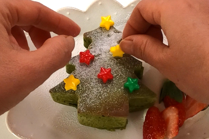 今回は生クリーム、粉糖、いちご、星型タブレットで飾り付けしました。