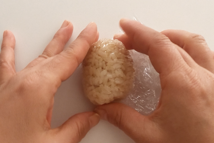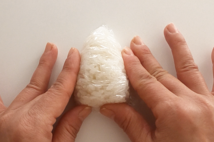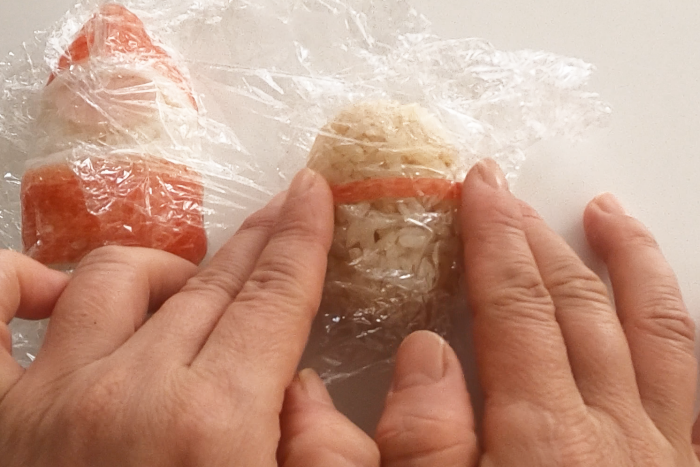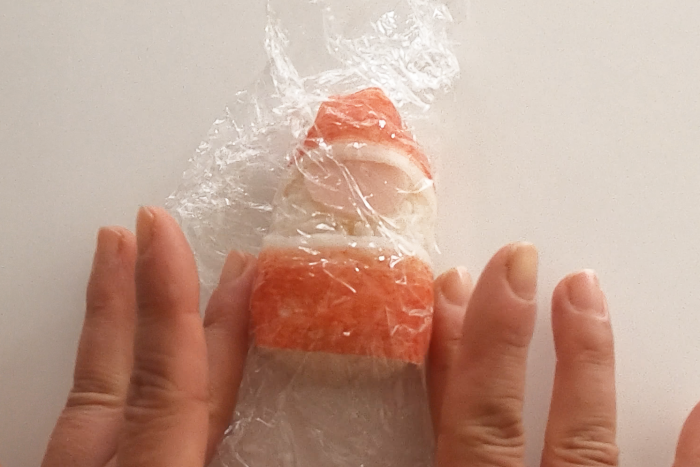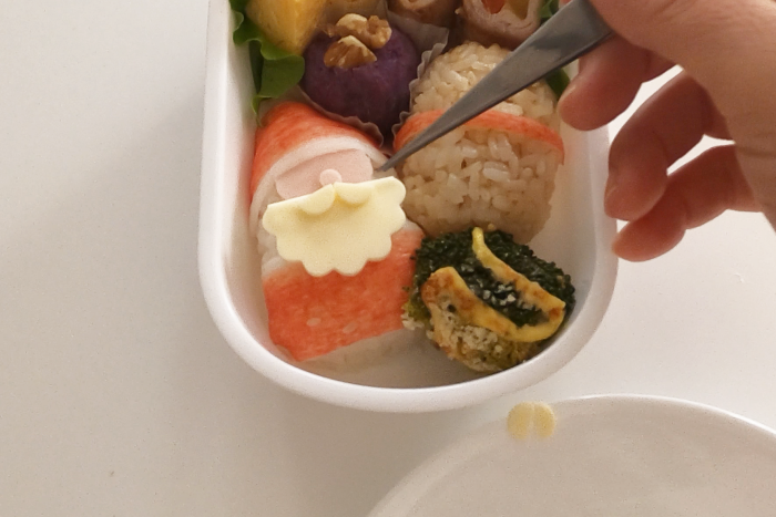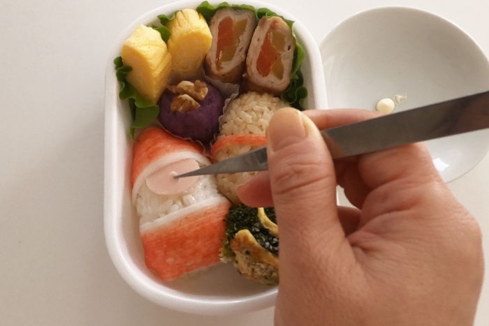 ハム同士を貼り付ける場合やカニカマやハムに海苔を貼り付ける場合、少量のマヨネーズを付けることではがれにくくしています。