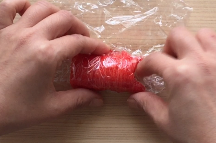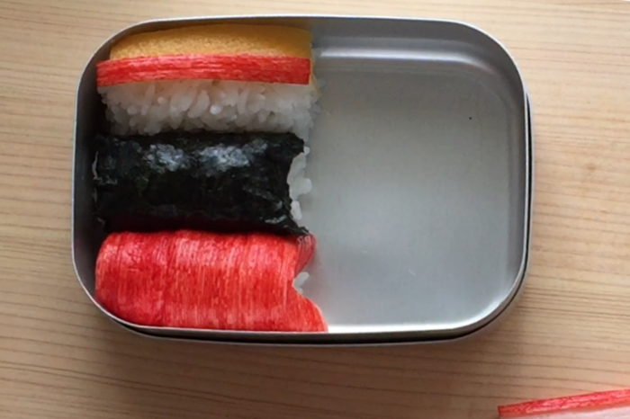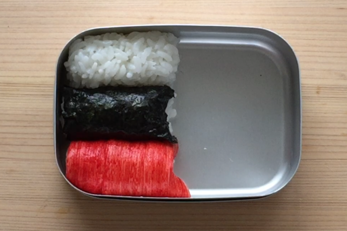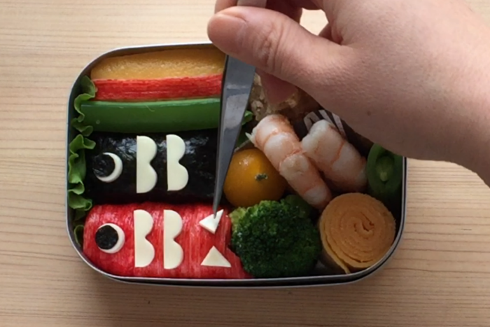 2.1つにカニカマの赤い部分をはがして巻き付ける。尾びれの部分はⅤにカットして馴染ませお弁当箱に詰める。