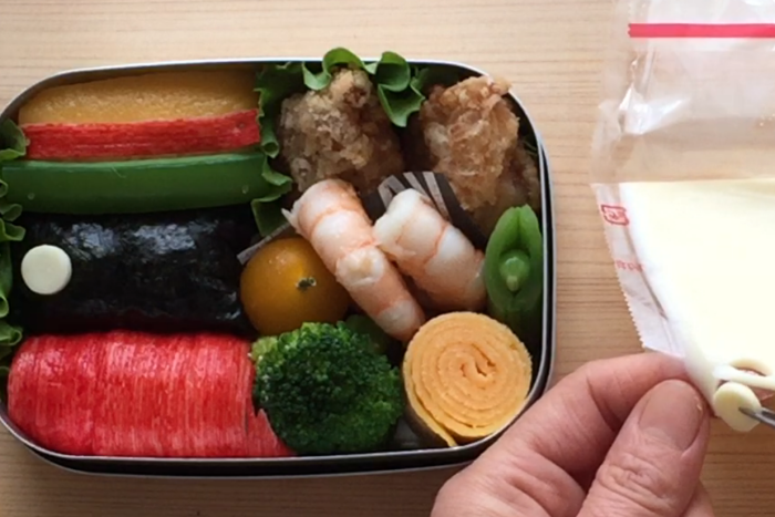 6.スナップエンドウは水気をふき取り細く切って乗せる。短く折った乾燥パスタをさして固定すし、おかずを詰める。