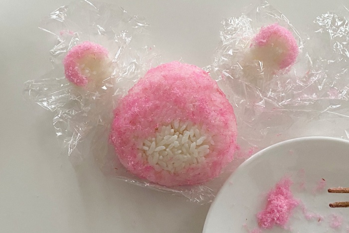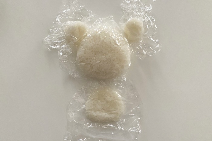 1.ごはんをラップに包み、顔、耳、鼻周りの部分を握る。