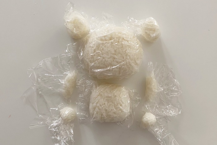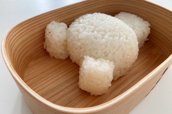 1.ごはんをラップに包み、顔、耳、体、手、足をそれぞれ握る。