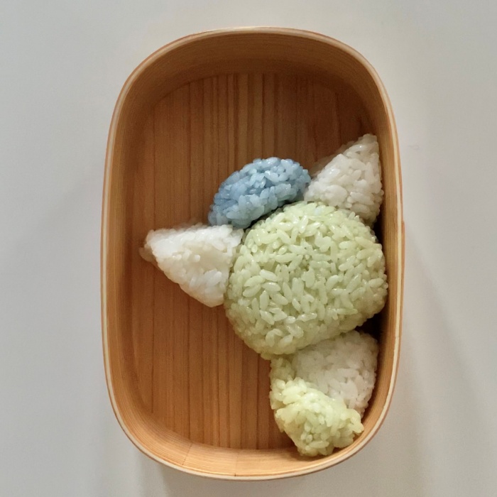 3.帽子はごはんにバタフライピーパウダーを混ぜて握る。