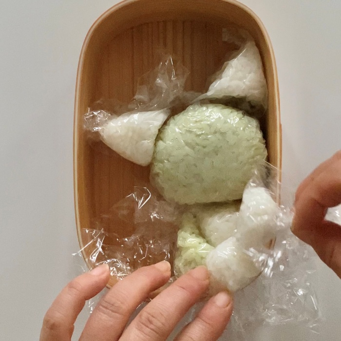 全て握ったらラップに包んだままお弁当箱に入れてバランスチェック。
