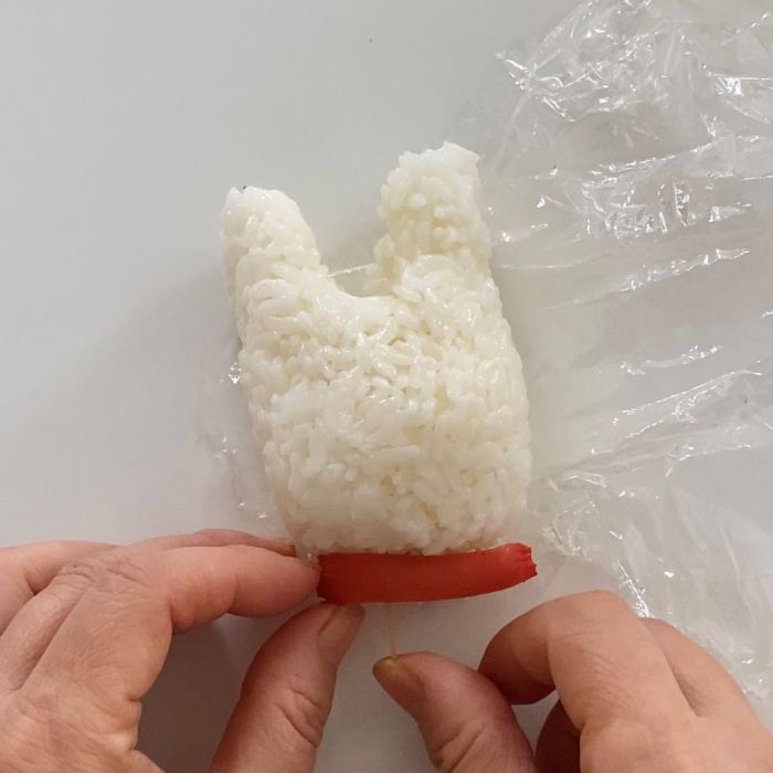 3.ウインナーをカットしてリサの顔の下にとめる。
