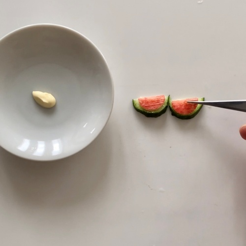 3.きゅうりを半月に切り、カニカマの赤い部分は一回り小さな型で半月にぬく。