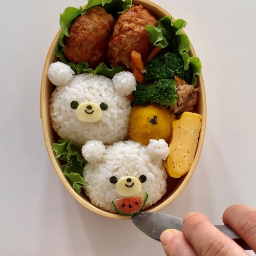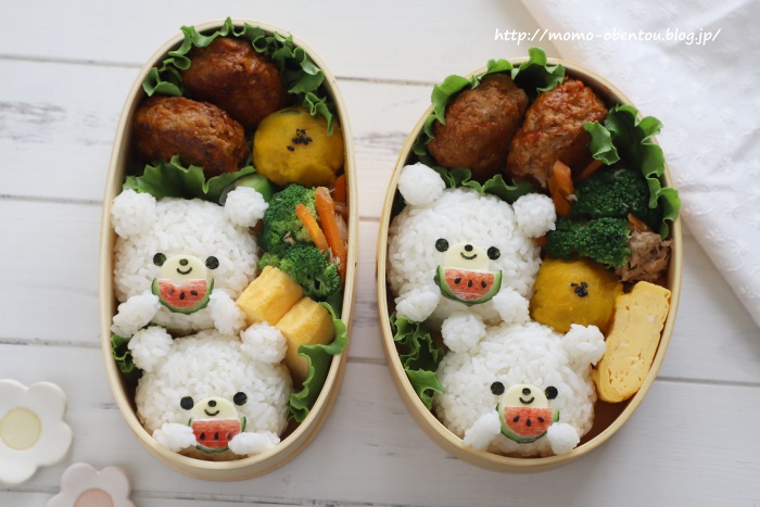 夏っぽいお弁当が作りたくてスイカを食べるシロクマツインズ。