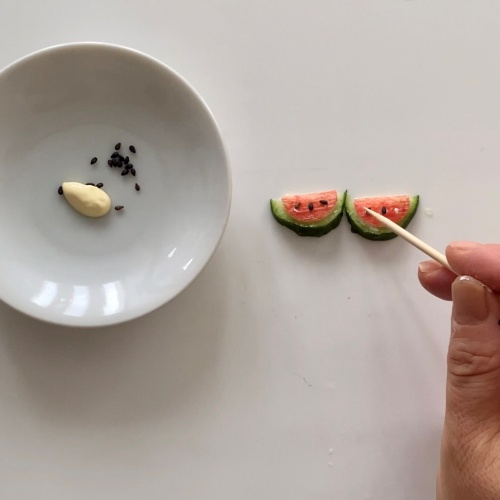 5.カニカマに竹串の先でマヨネーズを付けて黒ゴマを貼り付ける。