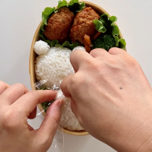 1.パーツの分のごはんを少しのこして、ごはんを2等分して顔をにぎる。