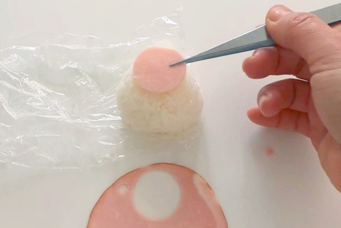 ストローで抜いておいたハムにマヨネーズを付けてサンタの顔に貼り付ける。