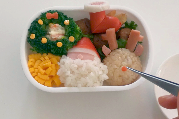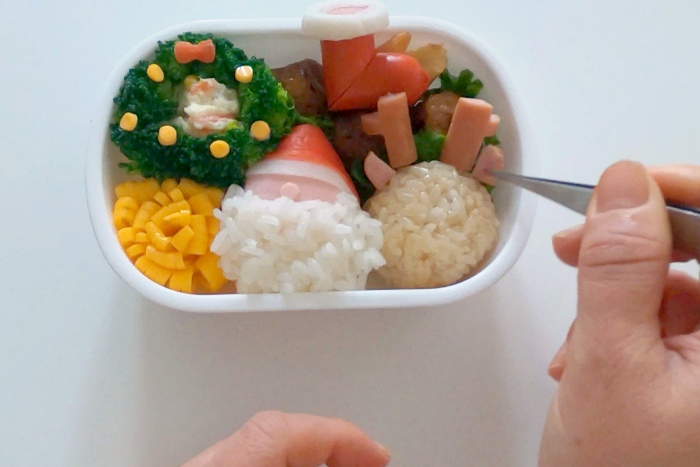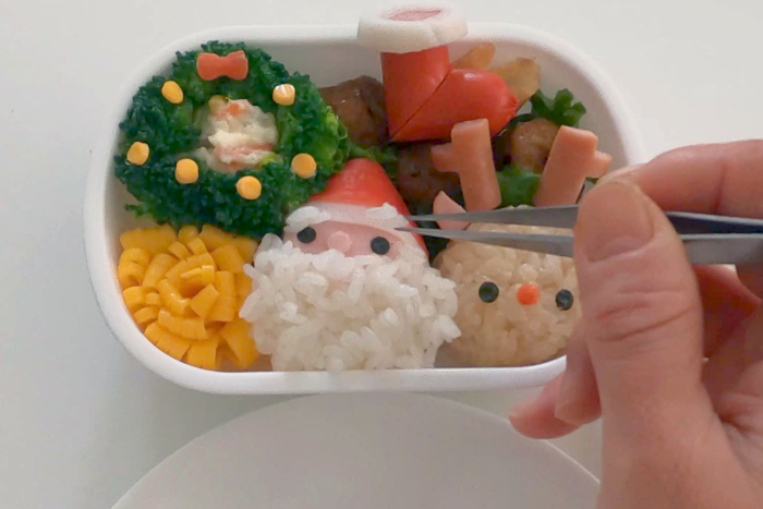 10.残しておいたごはんをサンタの目の上に乗せる。