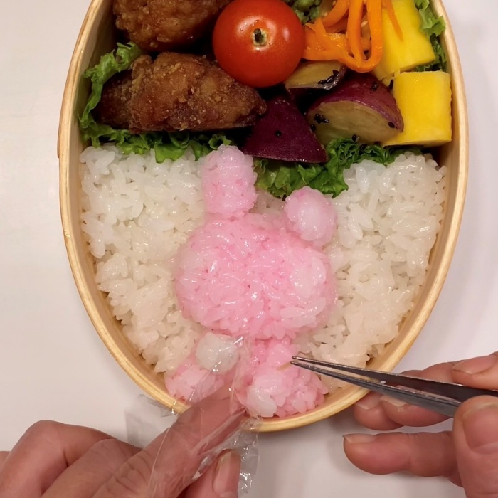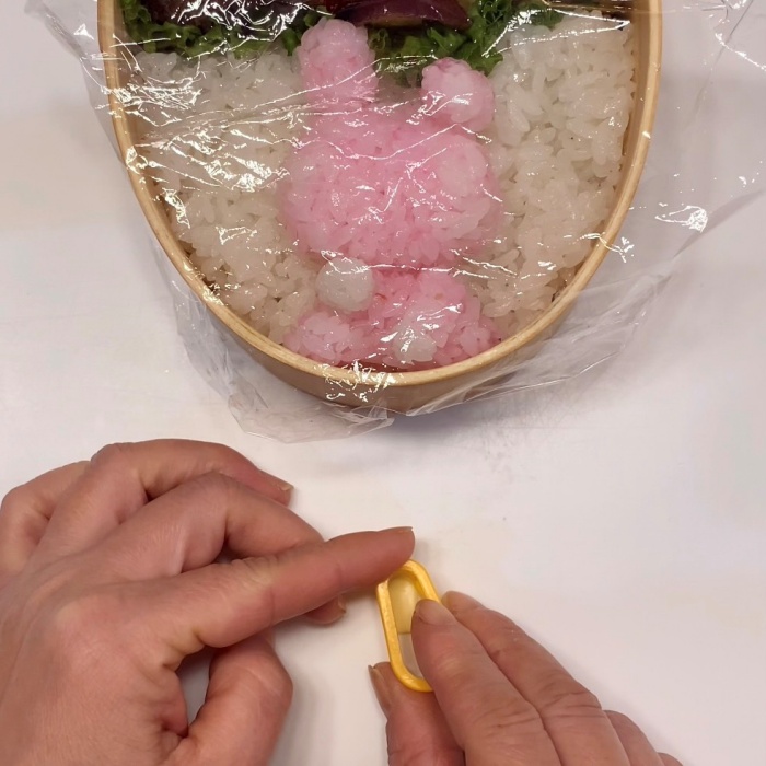 右手は白ごはんで丸く、左手は白ごはんと桜でんぶごはんを合うよう