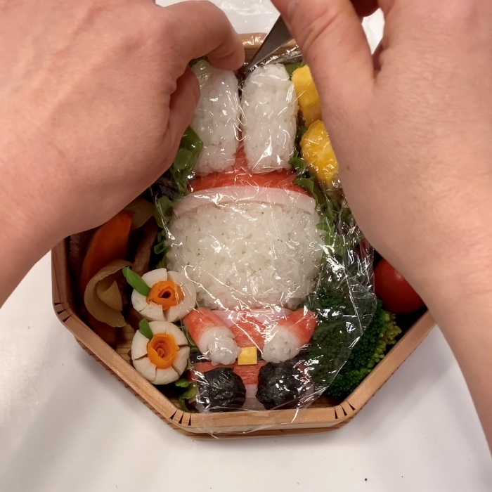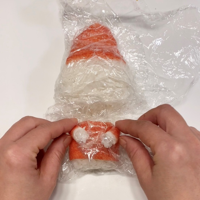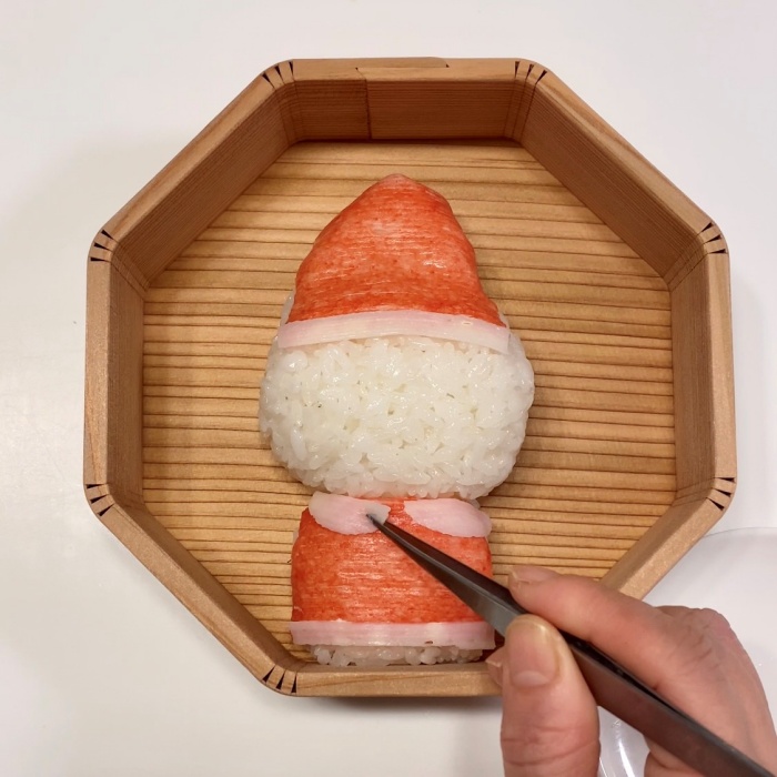 2.1の頭の部分、体、手にカニカマの赤い部分を巻く。