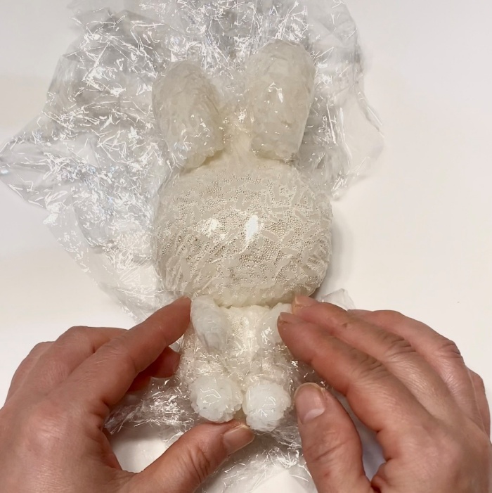 1.ごはんをラップに包み、顔、耳×2、体、手×2、足×2をにぎる。