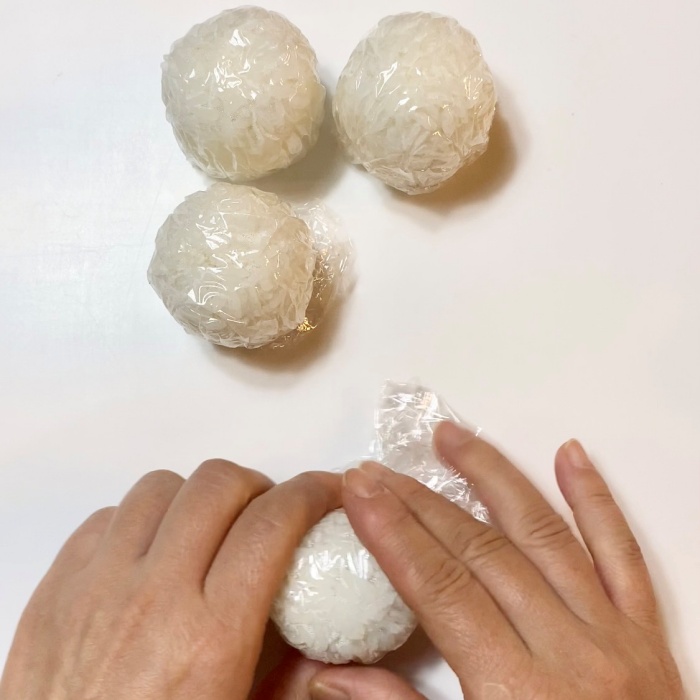 1.ごはんをラップに包み、丸く握ります。同じ大きさを4個作り