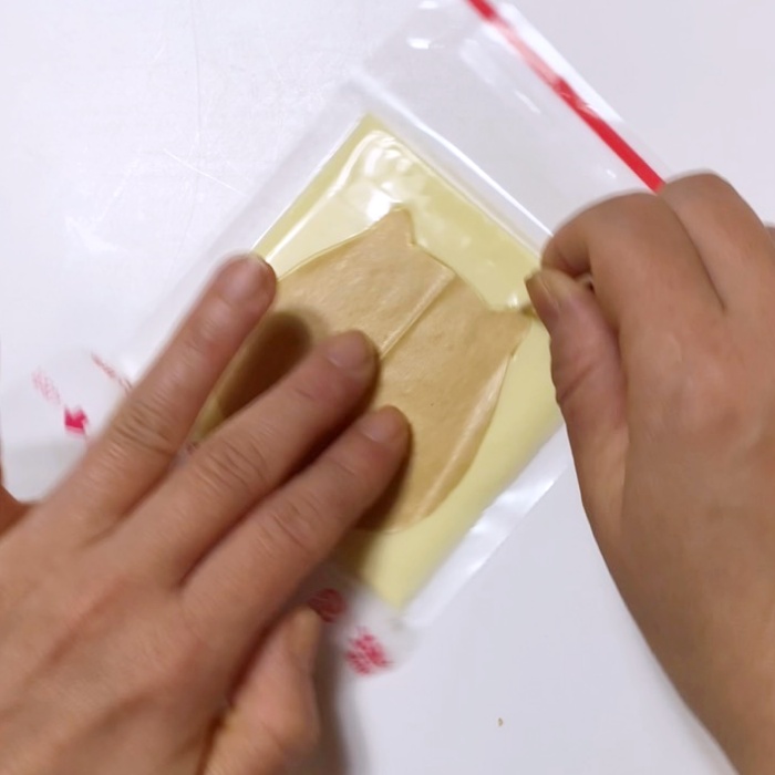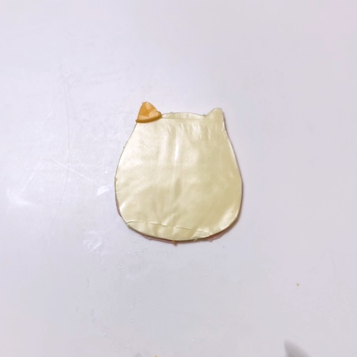 2.ねこの型紙をクッキングシートで作り、スライスチーズに貼り